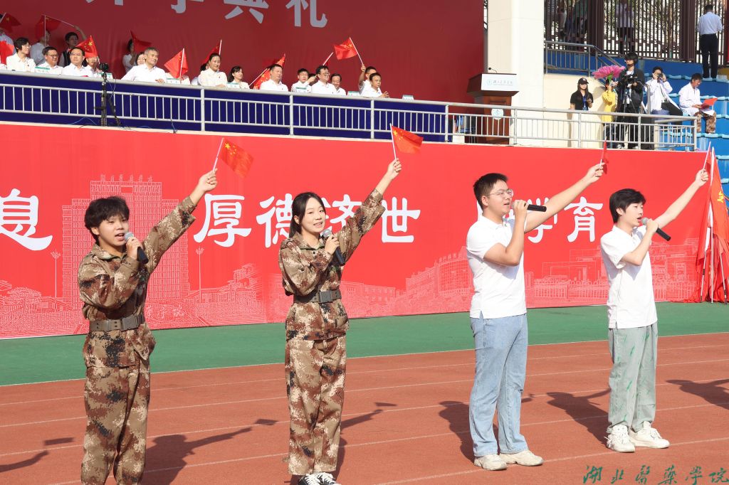“健康所系,性命相托……”最后,全体新生身着医师服、护士服,高举右拳,庄严宣读《医学生誓词》,立志不忘理想追求,以奋斗之姿,书写新时代答卷。七十五载长歌奋进,赓续前行再奏华章。师生挥动国旗,深情合唱《歌唱祖国》。伴随着嘹亮的歌声,一面长17.28米、宽11.52米的巨幅五星红旗也被数十名新生高高托举,大步走进队列中间。同学们用青春的声音告白祖国,向新中国成立75周年献礼。(审核 陈建龙)