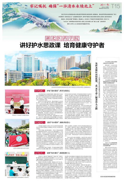 习近平总书记的重要回信让湖北医药学院师生备受鼓舞,倍感振奋。湖北医药学院在持续深化“学习回信精神、当好忠诚卫士”主题教育实践中,将守护国家水安全战略与落实立德树人根本任务深度融合,系统性构建“管理融入、阵地嵌入、文化渗入”的新时代思政教育体系,形成了以“水生态 ”为鲜明标识的协同育人特色,着力培养心怀“国之大者”、秉承科学精神、坚守仁心仁术的新时代健康守护者。