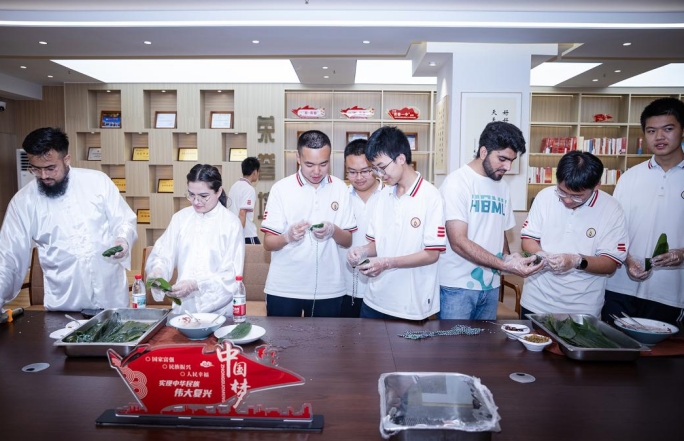 最具烟火气的包粽子环节将活动推向高潮。中外学生分组协作,从粽叶折叠、糯米填充到棉线缠绕,在手把手教学中感受端午民俗的温度。来自巴基斯坦的留学生卡米表示:“第一次包粽子很有趣,原来每一片粽叶都包裹着中国文化的味道。”