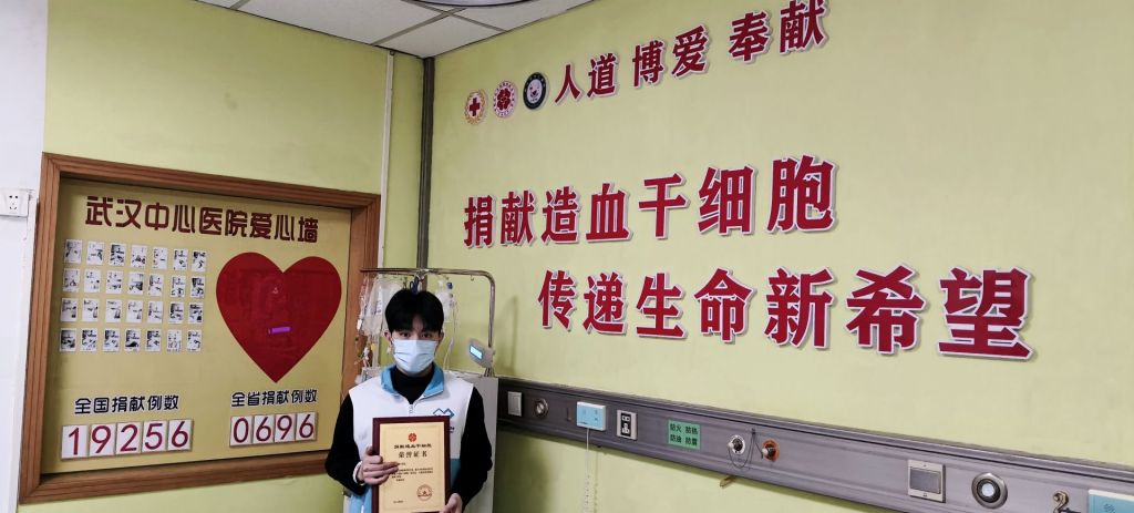 2025年1月7日上午,华中科技大学附属武汉市中心医院血液内科造干采集室内,随着采血泵的启动,鲜血从湖北医药学院临床学院药护康复专业的陈梓锋(化名)同学体内缓缓流出,被分离、再回输。经过4个多小时,造血干细胞悬凝液被一点点采集出来,在第一时间送往西南地区患者所在医院。陈梓锋成为中华骨髓库第19256例,湖北第696例造血干细胞捐献者,十堰第34位造血干细胞捐献者。