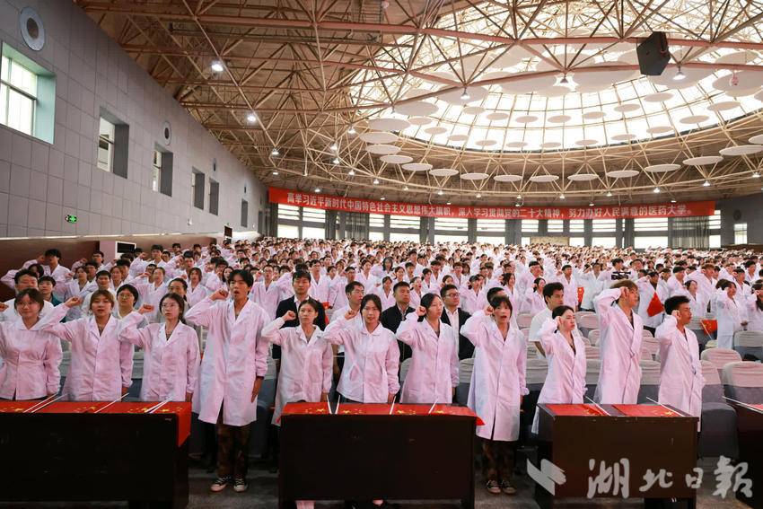 最后,全体新生高举右拳,郑重许下医学生誓言,“健康所系,性命相托,当我步入……”,铿锵誓言掷地有声,表达了全体新生投身医学事业、守护人民健康的坚定决心。