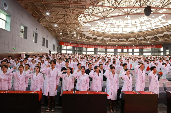 最后,全体新生高举右拳,郑重许下医学生誓言,“健康所系,性命相托,当我步入……”,铿锵誓言掷地有声,表达了全体新生投身医学事业、守护人民健康的坚定决心。