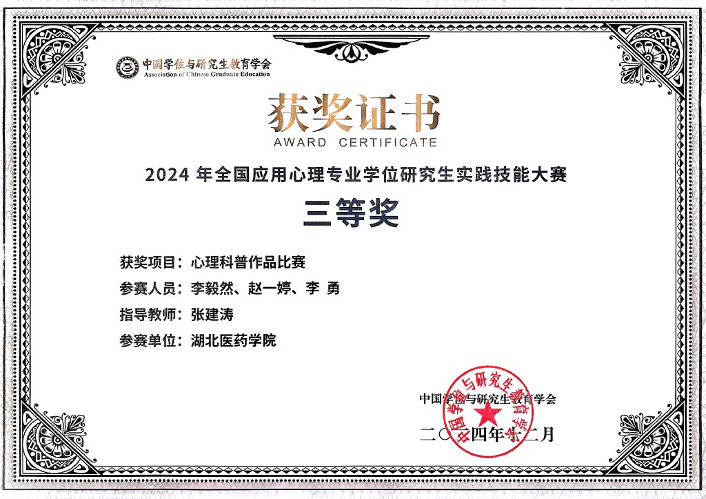 此次大赛吸引了全国众多高校的积极参与。经过激烈的角逐,由张建涛博士指导的我校应用心理硕士研究生李毅然、赵一婷和李勇创作的科普作品《防住暗箭:化解消极攻击》,凭借扎实的专业知识和创新的实践能力脱颖而出。获奖作品展现了团队在心理健康科普领域的专业水平和创新能力,充分体现了我校应用心理专硕实践教育的卓越成果。