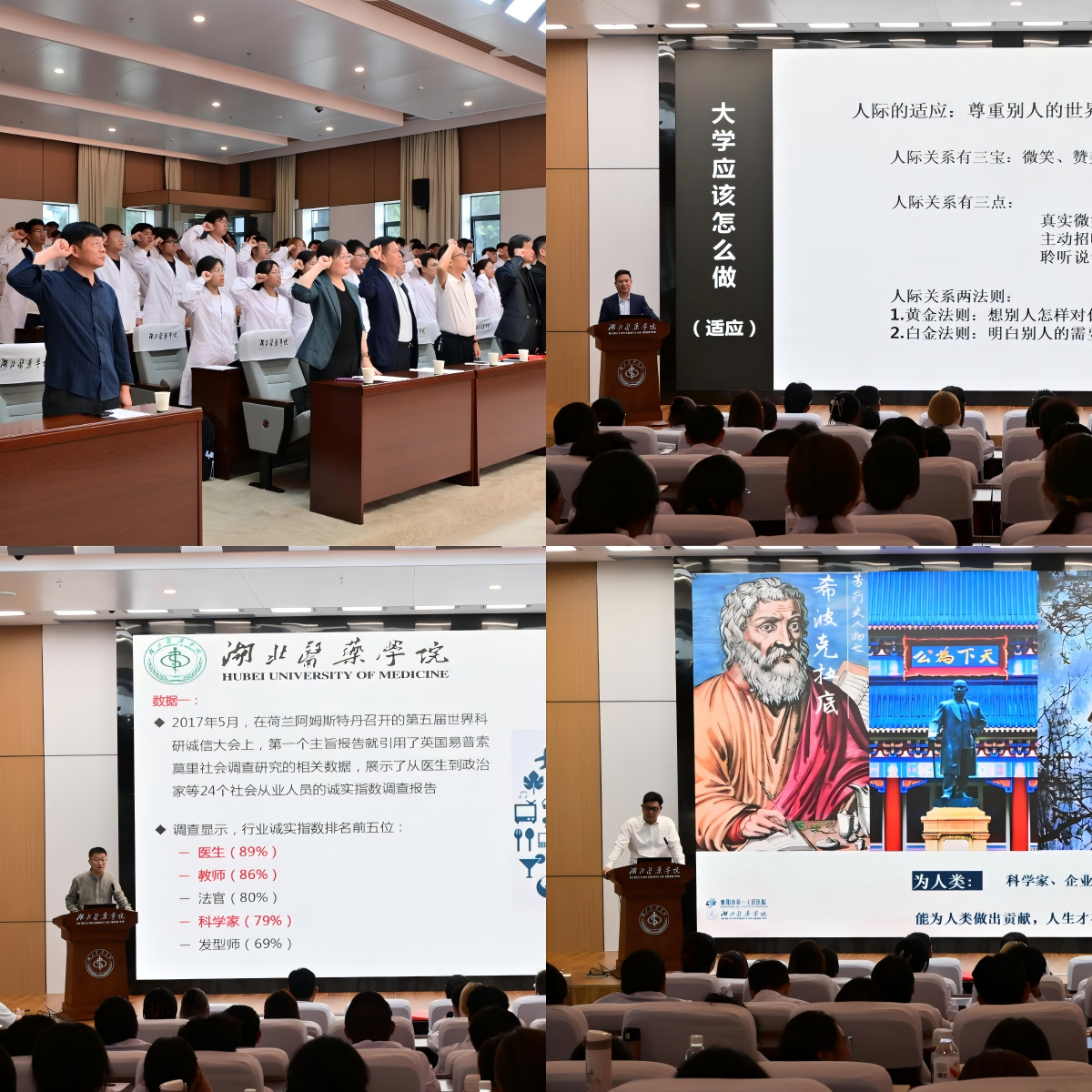 焦蓉带领全体新生宣读医学生誓词,“健康所系,性命相托”的铮铮誓言在会场中久久回荡。专业思想教育环节,杨军围绕“在变化的环境中调整自我”这一主题,重点围绕大学应该做什么、应该学什么、应该怎么做这三个问题为同学们答疑解惑。桑明就“谨遵学术理论,恪守科研道德”开展了一场学术诚信教育,他告诫同学们,做学问要求真为本、求新为要、求实为魂,希望大家诚信做人,踏实做事;实事求是,穷究真理。刘岳则为同学们上了职业生涯规划第一课,从目标确立、方法探寻、坚守初心三方面为新生厘清成长方向。