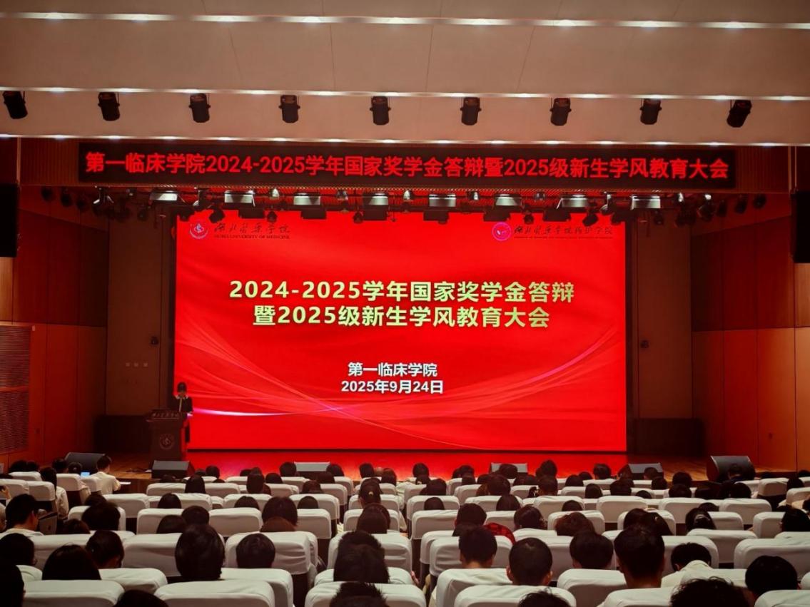 本网讯(通讯员 高煊 赵福厦 徐杨)9月24日下午,第一临床学院在公卫一楼学术报告厅举办2024-2025学年国家奖学金答辩会。校团委副书记廖佳龙、学院全体辅导员老师、优秀学生代表及2025级新生共同参加,活动由王小燕老师主持。