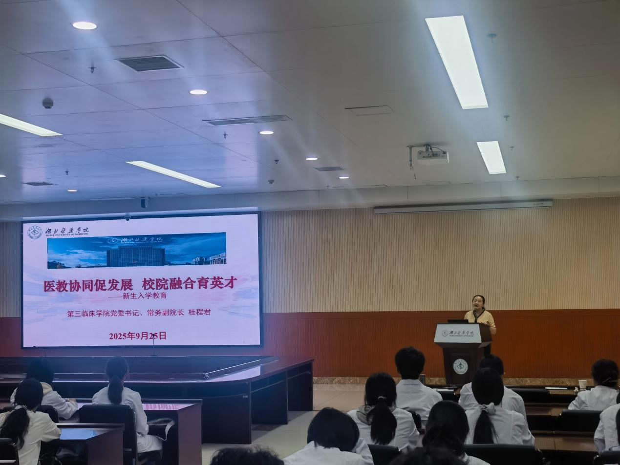 本网讯 (通讯员 张明)9月25日晚,第三临床学院在学校科教楼多功能厅举行2025级新生入学教育暨2024-2025年度优秀学生表彰大会,直属附属人民医院党委书记昝琨,第三临床学院全体院领导及2025级本科生参加大会,学院党委副书记李芹主持活动。