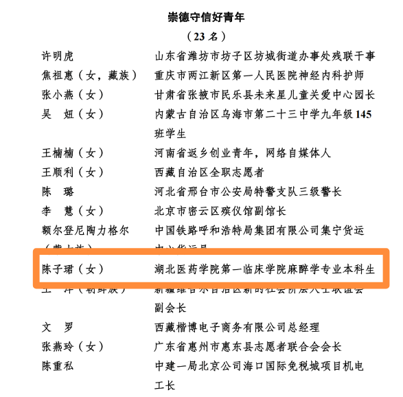 本网讯(通讯员:张慧丽、孙小虎)近日,共青团中央发布2022年“全国向上向善好青年”拟入围名单,563个身边榜样接受群众代表评议及网友点赞,确定了爱岗敬业、创新创业、勤学上进、担当奉献、崇德守信5类共计142名“全国向上向善好青年”,第一临床学院麻醉学陈子珺榜上有名。