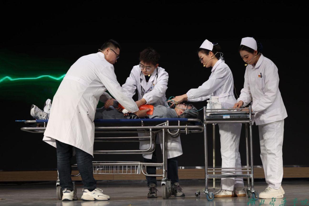 决赛分为活力创新展示与实践技能展示两个环节。在活力创新展示中,第三临床学院研究生党支部以支部成员史世杰街边救人的事迹为原型,编演情景剧《医者仁心》,充分展现支部成员恪守大医精诚、勇担健康使命的精神,激励新时代青年医学生用青春与热血书写无愧于时代的华章,为守护人民群众生命健康不懈努力。实践技能展示环节,支委游震同志展示出其扎实的党务理论功底和临场应变能力。