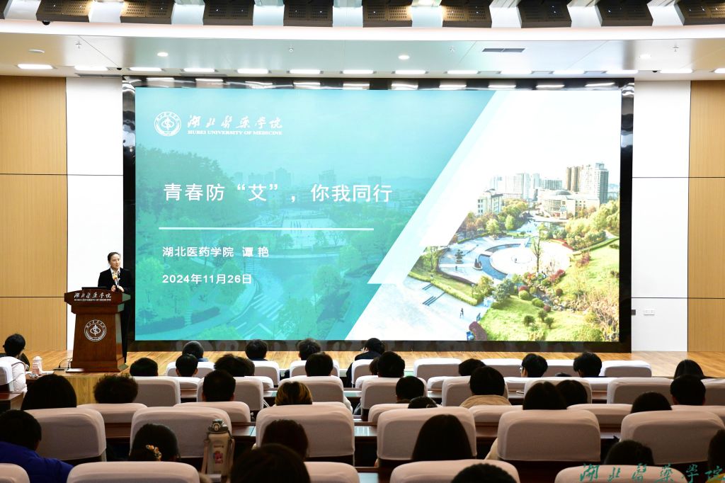 本网讯(通讯员 钟骅)11月26日下午,我校在公共卫生与健康大楼二楼报告厅开展“青春防‘艾’,你我同行”主题讲座。活动由校团委主办,青春健康小组、大学生科普协会承办,十堰市计生协协办。讲座邀请校党委常委、统战部部长谭艳担任主讲人。