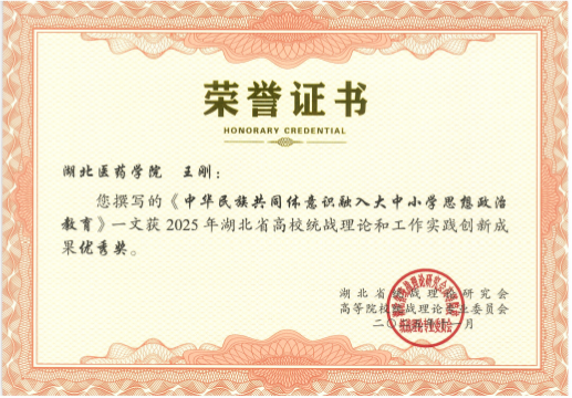本网讯(通讯员 欧阳妮)近日,全省高校统战理论研究会第40次学术年会在荆州长江大学举行。大会表彰了2025年湖北省高校统战理论和工作实践创新优秀成果奖。我校3项成果斩获殊荣,其中药学院廖婧羽老师撰写的论文《认知、情感与意志:心理学视域下高校铸牢中华民族共同体意识教育的思考》获二等奖,药学院王红梅老师撰写的《民主党派推进中国新型政党制度理论体系和话语体系建设的路径研究》、马克思主义学院王刚老师撰写的《中华民族共同体意识融入大中小学思想政治教育》论文均获优秀奖。