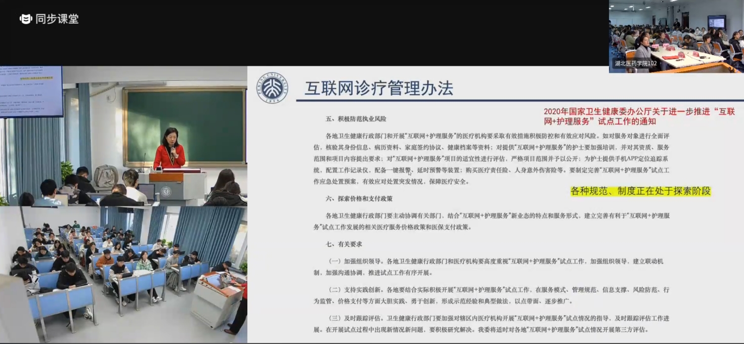 启动仪式结束后,北京大学护理学院与湖北医药学院护理学院师生共同聆听了北京大学吴雪老师精彩的讲授。吴雪围绕线上挂号、远程护理、移动护理等内容,讲解了新时代互联网在护理领域的创新应用,着重介绍了传送机器人、智能手环、线上小程序等应用。课堂上,运用智慧树平台和线上英文课程资源(《nursing informatics》)等多种信息化教学手段,参加活动的师生积极参与互动,分享自己的观点和经验,使得教学更加生动。最后,吴雪带领湖北医药学院《护理信息学》授课教师张振桐、曹琼雅,一同组织了现场测试,引导两校近200名学生共同讨论和巩固知识,加深对数字化、信息化对护理领域影响的认识。尽管相隔千里,相聚云端,但学生全程积极参与,课堂气氛热烈。