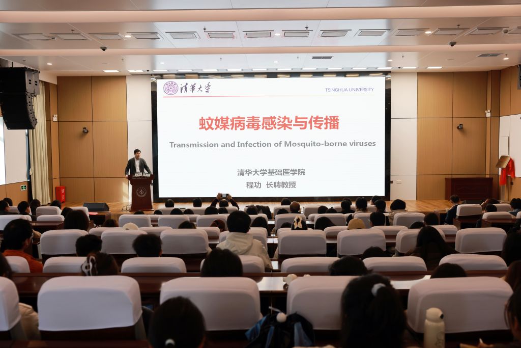 “程功专家工作站”成员刘龙博士汇报工作站建设规划。随后,程功教授进行学术报告,以“蚊媒病毒感染与传播”为汇报主题,全面介绍了蚊媒病毒在自然界中传播流行的生物学原理,并从蚊媒病毒、宿主及人体三个层面详述了病毒传播的分子机制及潜在干预策略,对预防未来新发突发蚊媒传染病有重要意义。