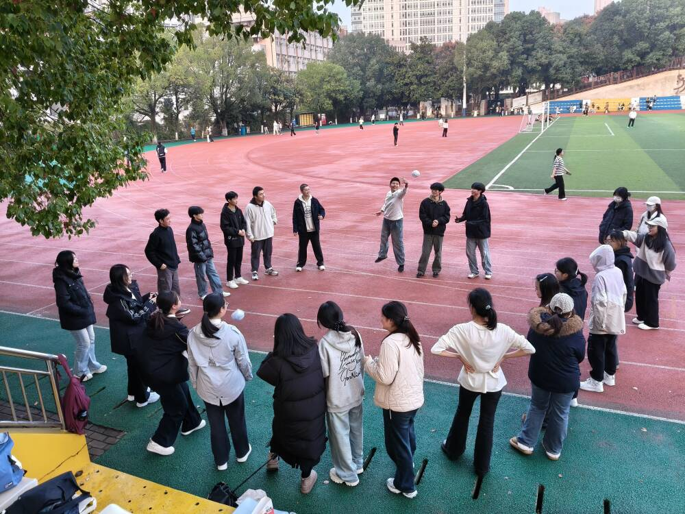 “快递小球”接力赛率先点燃气氛,两人一组用球拍托乒乓球穿梭跑道,小球微晃间,同学们屏息稳步,为队友平衡欢呼、为失误鼓劲,呐喊声打破午后宁静。随后,活动接续升温,“守护气球”中,两人挽手协作,一人护球、一人攻敌,灵活躲闪间尽显默契,气球爆破或成功守护时欢呼声不断;“蒙眼纸棍互打”里,同学蒙眼持棍凭听觉试探挥击,队友“声东击西”的指挥让场面妙趣横生,失误“误伤空气”的滑稽场景引全场大笑。“击鼓传球”压轴登场,将活动推向高潮:全体同学围圈传足球,鼓点骤停时持球者表演节目。足球飞速传递,众人专注敏捷,既有传球的紧张感,也有才艺展示的欢乐,笑声与掌声中班级凝聚力悄然升温。