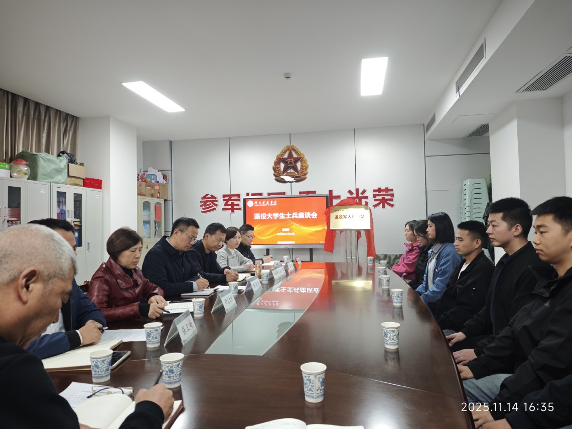 本网讯(通讯员 李良俊 成家洋)11月14日下午,我校退役大学生士兵座谈会暨退役军人服务站揭牌仪式在科教楼518征兵工作站举行。校党委常委、宣传部部长陈建龙出席会议,校武装部、教务处、研究生院、保卫处、后勤处等相关部门负责人与数十名退役复学大学生代表齐聚一堂,共话成长与发展。