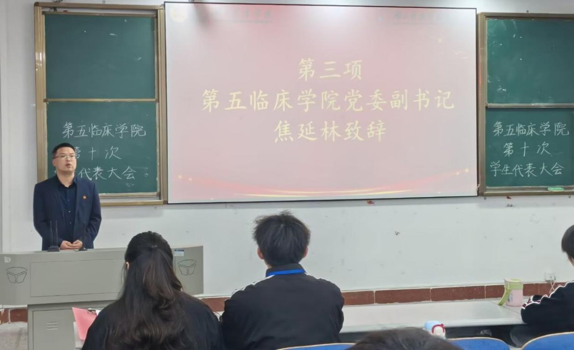 本网讯(通讯员 刘立超 郑舒妍) 11月16日下午,第五临床学院于5211教室召开了第十次学生代表大会。学院党委副书记焦延林、团委书记陈静、校学生会轮值主席吴雨霏和来自学院各班级89名学生代表出席本次会议。