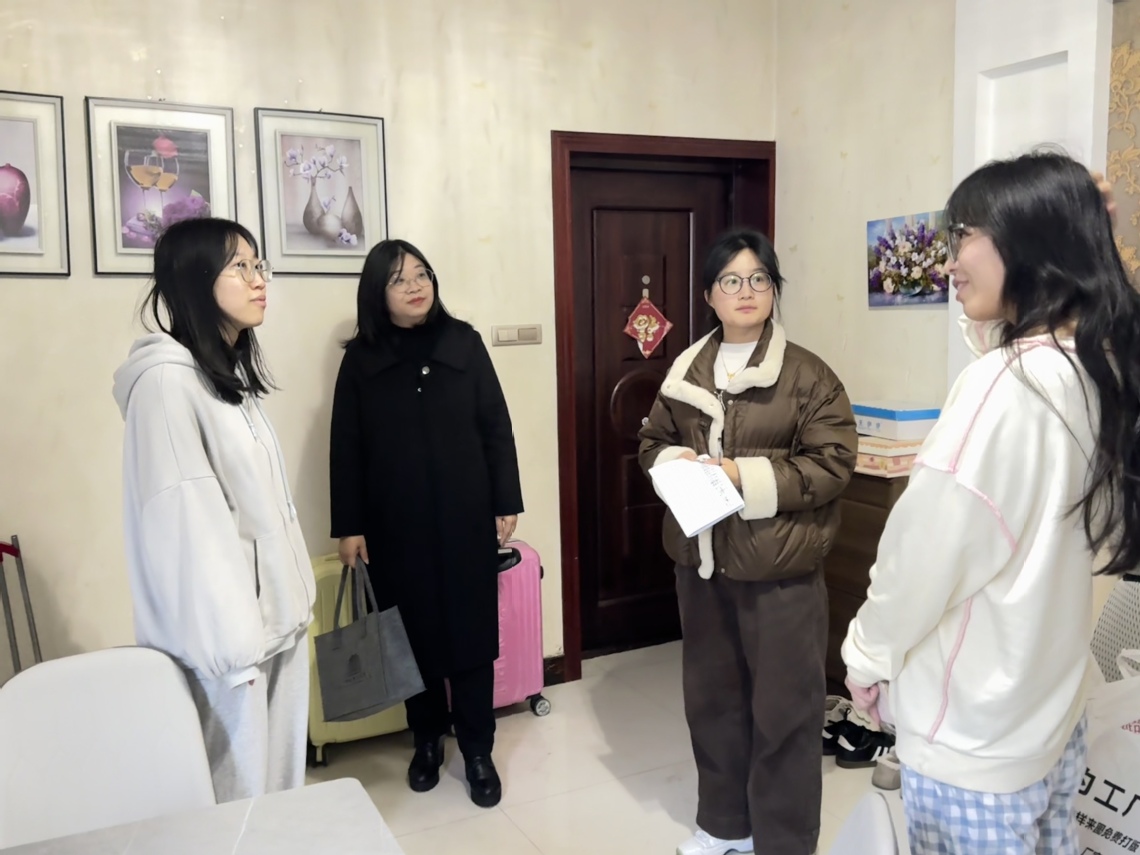 本次走访行动覆盖面广、针对性强,三个小组分头走访了分布在18个小区的31户住所,亲切看望了53名实习生。走访过程中,领导与老师们不仅细致排查用电、燃气、消防及周边治安等安全隐患,叮嘱学生牢固树立安全意识,更与同学们促膝谈心,关心其身心状况、实习进展与日常生活,倾听他们在适应社会、平衡学业与工作中的困惑。针对学生普遍关注的职业发展问题,走访小组现场提供了耐心的就业指导与规划建议;对于个别学生的实际困难,则现场协调解决,切实为大家排忧解难。同学们表示,学院领导和老师们深入住所走访,让他们远在校园之外依然感受到了来自“家”的浓浓关爱,将以更饱满的状态投入到接下来的实习工作中。