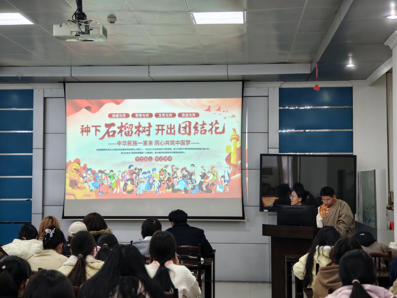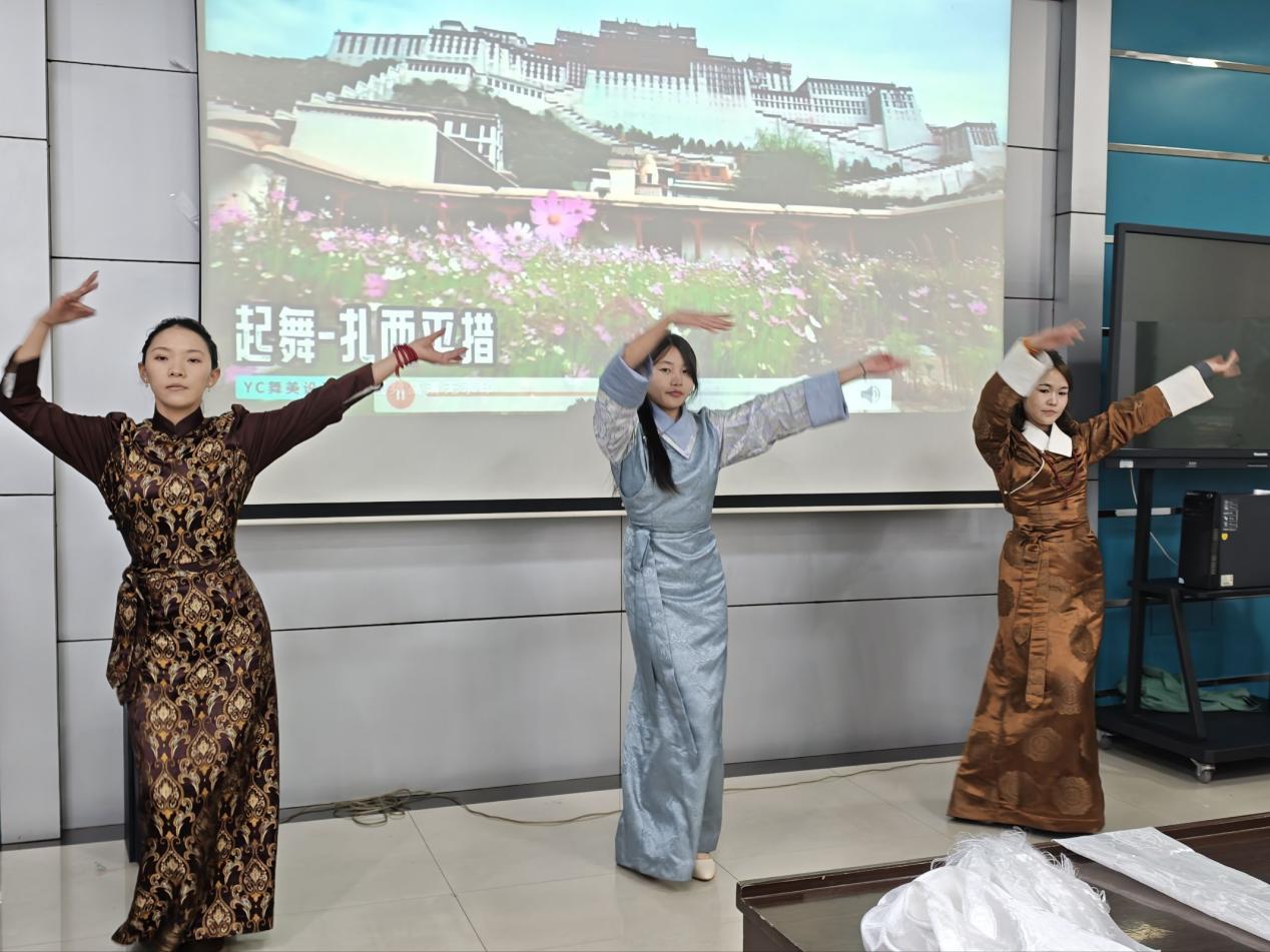 主讲人拉珍以“文化传承与生活习俗”为核心,从藏族历史发源、高原特色文化地标、唐卡、舞蹈、手工艺等方面来讲述。他还讲解了藏族人民适应高原气候的饮食习惯文化和卫藏、康巴、安多等不同地区服饰的独特风格,细致介绍了藏历新年“切玛祈福”、雪顿节藏戏展演、望果节绕田祈福等传统节庆的庆祝方式。格桑卓玛则聚焦“藏文化衍生价值与载体”,带大家领略藏族文化的深厚底蕴与时代活力。她重点介绍了藏医,讲解了藏医与中医交融互补的发展现状,以及《四部医典》数字化传承的创新实践,让同学们了解到传统医学为藏族同胞提供生命保障。此外,她还分享了尼木藏香、藏纸等非遗技艺的传承故事,让同学们看到传统文化的当代新活力。活动现场,藏族同学们热情洋溢地跳起了民族舞蹈,将现场氛围推向了高潮。