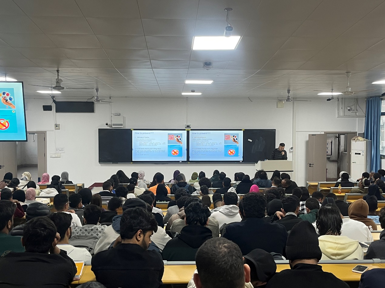 皮肤病与性病学专业研究生pankaj neupane和aakash koirala分别就艾滋病的历史、传播途径、病原学特征、预防与治疗等方面进行了详细讲解,让同学们全面了解艾滋病,深刻认识防控艾滋病的严峻形势以及预防艾滋病的重要性。神经病学研究生feysa negassa gemeda从校园环境中的常见传染病,疾病传播链条以及打破传播链条的标准预防措施的角度向现场同学普及了常见传染病预防知识。