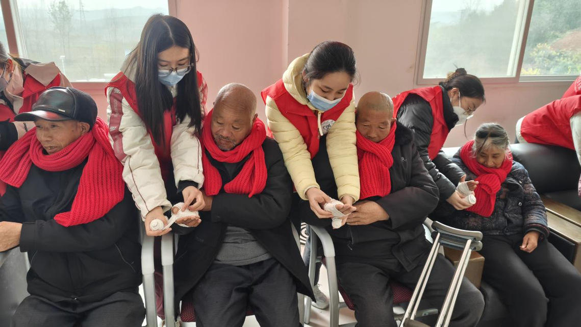本网讯(通讯员 王秀成)2025年12月2日,护理学院南丁格尔志愿服务队、周丽急救志愿服务队携手研究生党支部共赴丹江口石鼓镇农村福利院开展敬老关怀活动,以温情陪伴与专业技能为老年群体送去温暖。